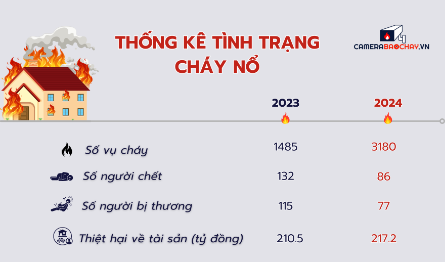 Theo thống kê của Cục cảnh sát phòng cháy, chữa cháy và cứu nạn cứu hộ tính đến hết tháng 9 năm 2024 toàn quốc xảy ra 3180 vụ cháy, làm chết 86 người, bị thương 77 người, thiệt hại về tài sản ước tính sơ bộ thành tiền khoảng 217.2 tỷ đồng; các vụ cháy rừng làm thiệt hại 571.27 ha rừng. So với cùng kỳ năm 2023, số vụ cháy tăng 1695 vụ, số người chết giảm 46 người, người bị thương giảm 38 người, không giảm, tài sản giảm 6.7 tỷ đồng.
