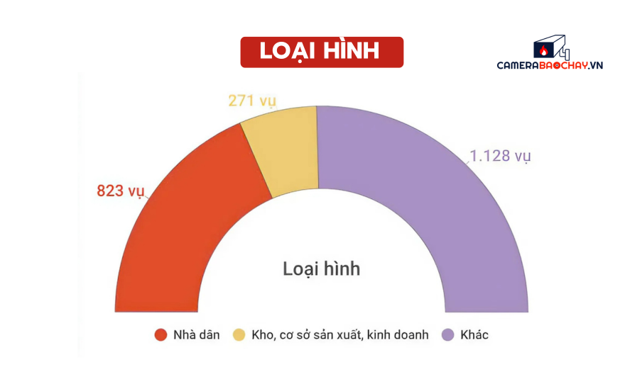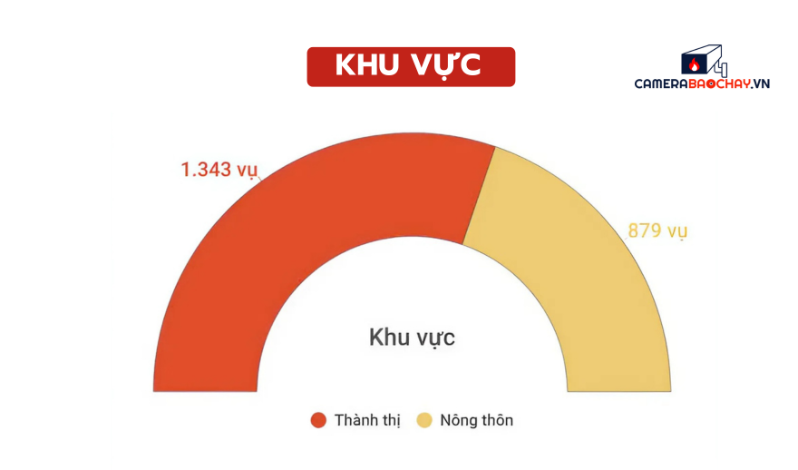 Cháy chủ yếu xảy ra tại khu vực thành thị với 1.343 vụ (chiếm 60,4%), nông thôn xảy ra 879 vụ (chiếm 39,6%). Trong đó cháy tại loại hình nhà dân vẫn chiếm tỷ lệ cao nhật với 37% (823 vụ); vụ cháy kho, cơ sở sản xuất, kinh doanh chiếm 12,2% (271 vụ). Các loại hình khác, mỗi loại hình đều chiếm tỷ lệ dưới 10%.